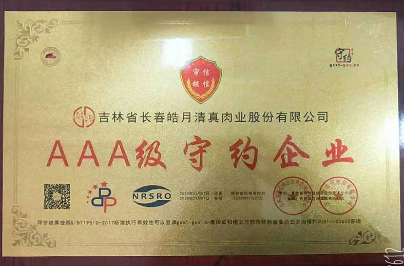 吉林省信用評(píng)價(jià)認(rèn)證中心AAA級(jí)食用企業(yè)等級(jí)證書